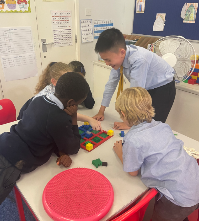 Year 7 returned to the Pre Prep to test out their Dragon Den designs of a Lego version of Tic Tac Toe. Last week they created their game with farm animals and fruits as well as designing the board to play on – all made from Lego. Trixie, Pelumi, Jack, Zachary and Henry spent the enrichment session with Year 1 and 2 pupils and had lots of fun chatting with the pupils and playing their game. Next week they will put together their presentation which will be pitched to the Holmewood Dragons! Katie Seecharan