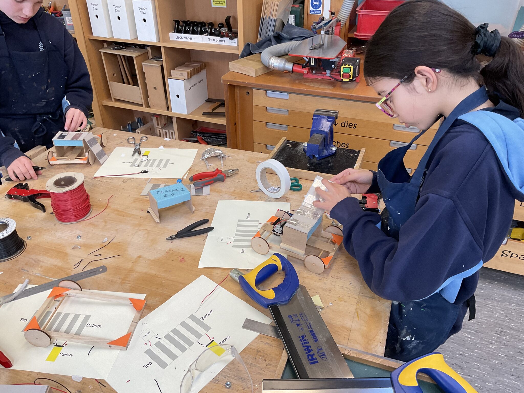Students are in the final stages of completing their battery powered car prototypes. The cars use a hand-made pressure switch connected to a 9v battery and DC motor. They then need to test functionality and see what needs improving and upgrading (such as the wheels). James Murray
