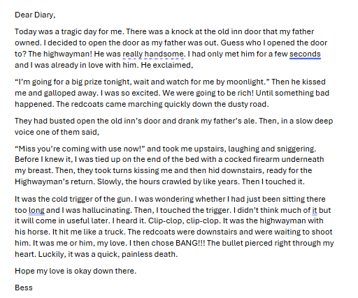 Miss Price’s Year 6 English group have been writing diary entries from the perspective of one of the characters in Alfred Noyes’ epic narrative poem, The Highwayman.