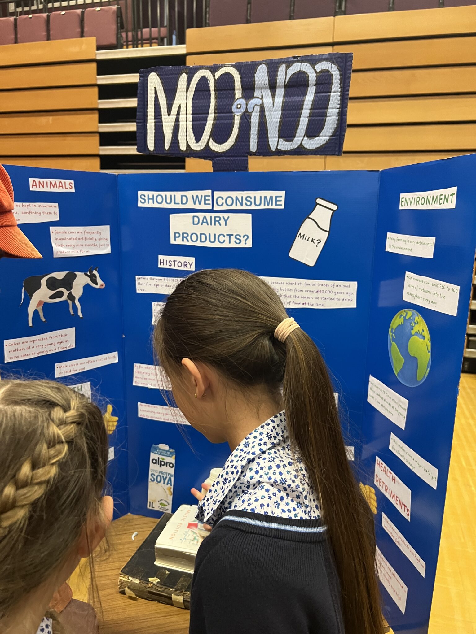 On Thursday 8th, our Year 8 pupils proudly showcased the culmination of their Personal Enrichment Projects—an ambitious initiative integrated into their Enrichment lessons throughout the Spring Term. Each student formulated a unique research question and embarked on a journey of independent inquiry, striving to develop expertise in their chosen field. The breadth of topics presented was both impressive and diverse, ranging from Colour Theory, to Bitcoin, to the Impact of Dairy, Dietary Choices, and the Influence of Fidget Toys on Learning.