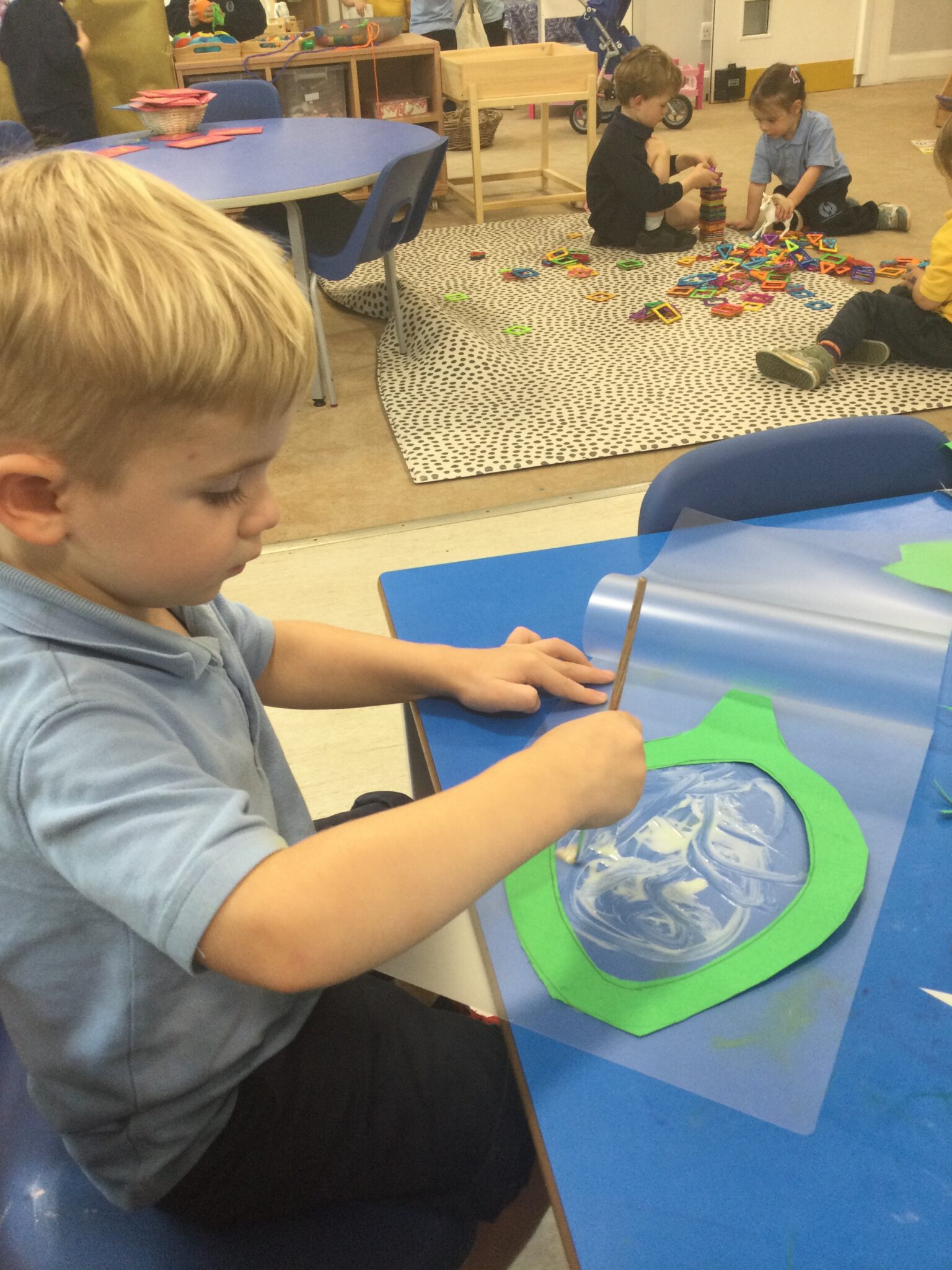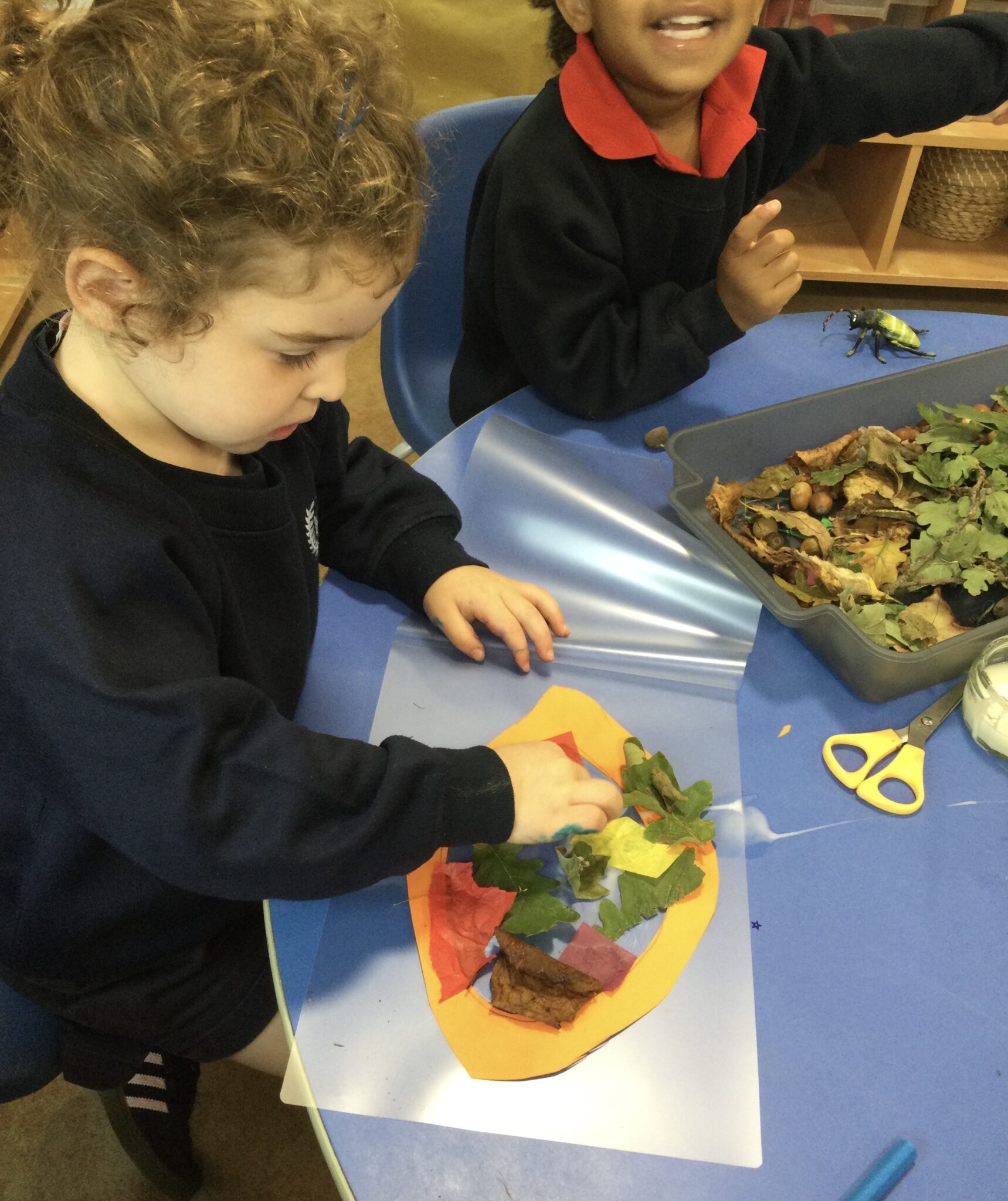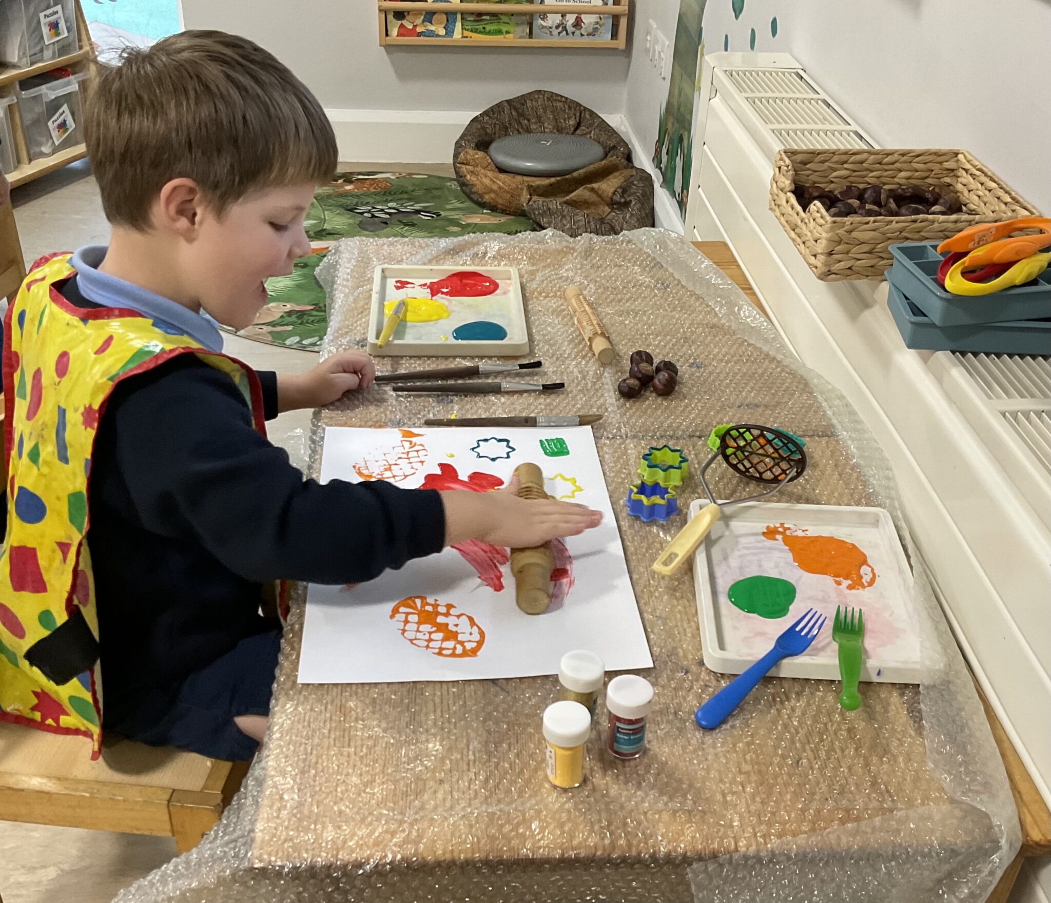 Our nature walks gave the children a chance to explore the outdoors and collect natural items such as colourful leaves, conkers, acorns, and sticks. These treasures sparked curiosity and conversation, and were later transformed into beautiful, handmade sun catchers. We then went on explore texture, pattern, and colour using mashers, rolling pins, forks, paint, and even conkers to design autumn pictures.