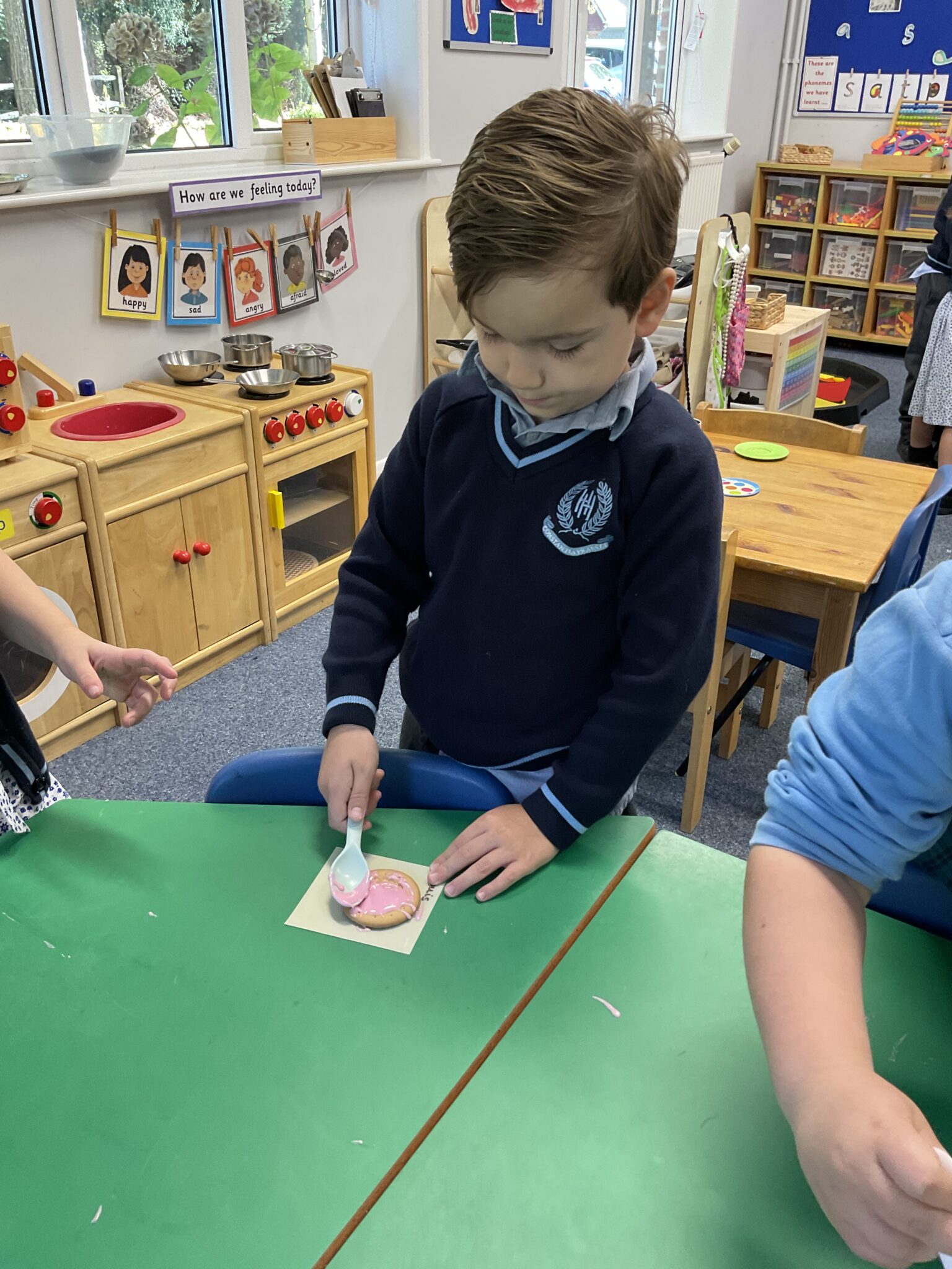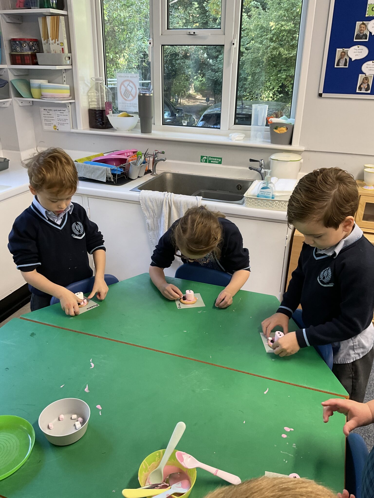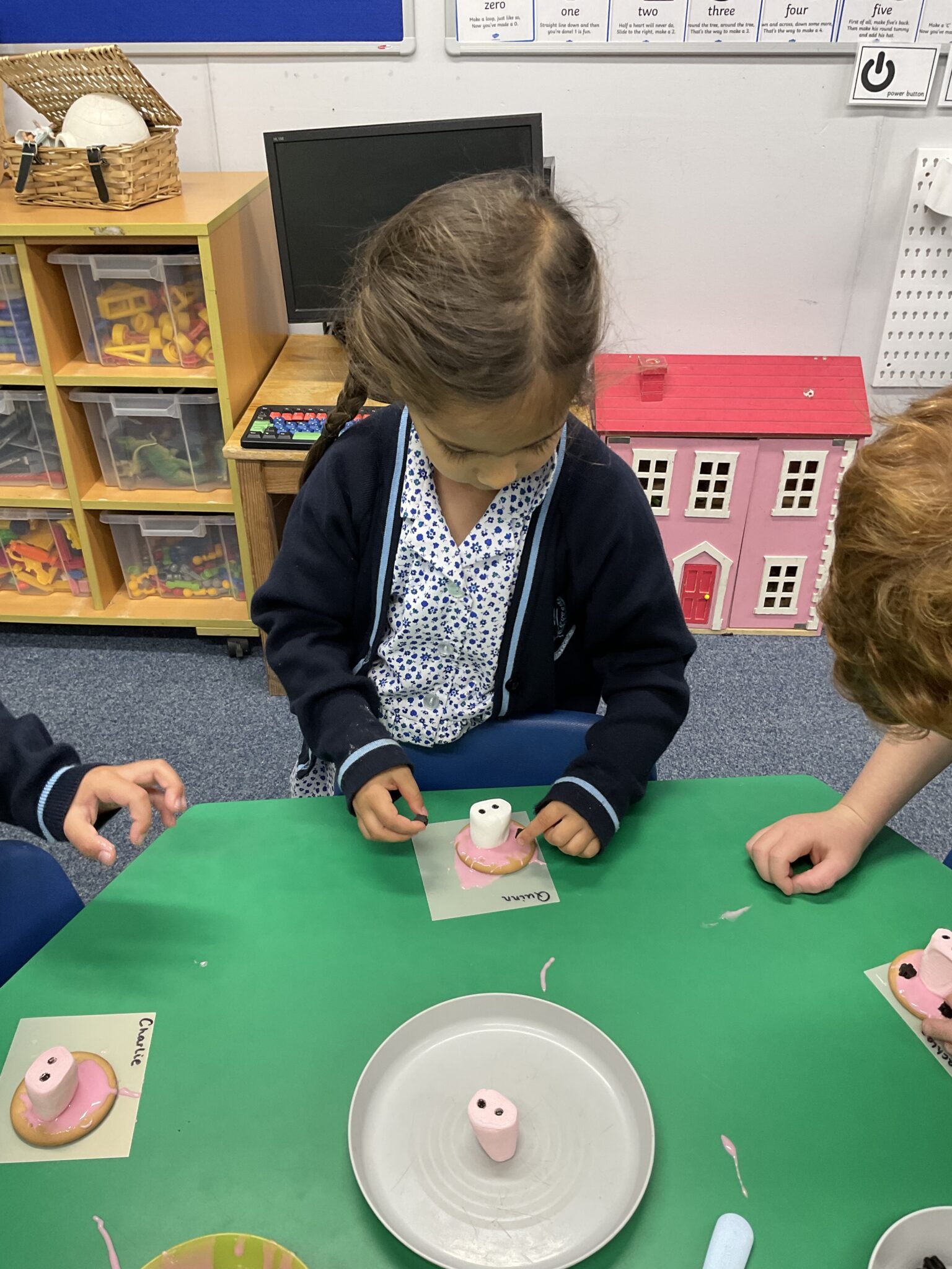 This week we have continued our topic of Fairy Tales learning about a favourite story of ‘The Three Little Pigs’. We read the story and then took turns playing the characters and acted out the story. We had a go at building houses using different materials to see which would work the best and why and even tested them by becoming the wolf to ‘blow the house down’. We talked about the people in our families and drew a picture of them, and we even baked our very own pig face biscuit – yum! Katy Shelton