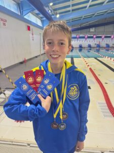 During 5 sessions this month, William competed in the Beacon Swimming Club’s Club Championships. He had lots of fun, achieved several PBs and won a number of ribbons and medals, including Silver in the 100m Backstroke and Bronze in the 200m Backstroke and 200m Individual Medley. What a great achievement, congratulations William!