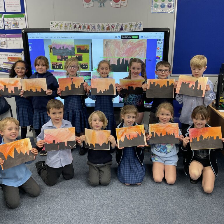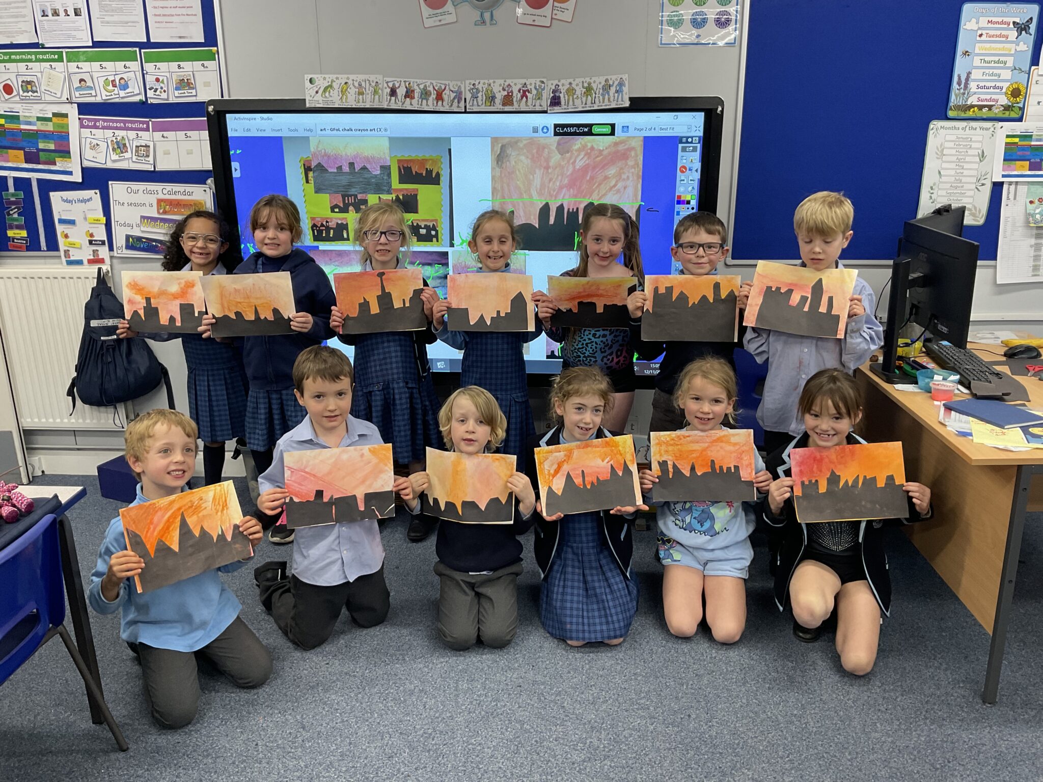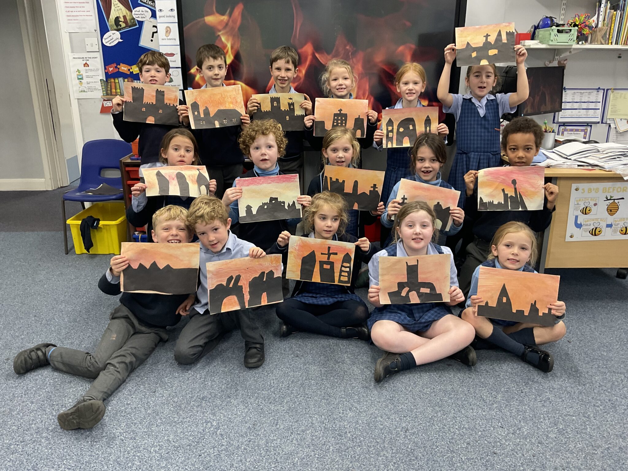 In art, we travelled back to London in September 1666. The children designed dramatic skylines inspired by the Great Fire of London, using chalk to create fiery skies and black paper to form striking building silhouettes. The results were truly eye-catching!
