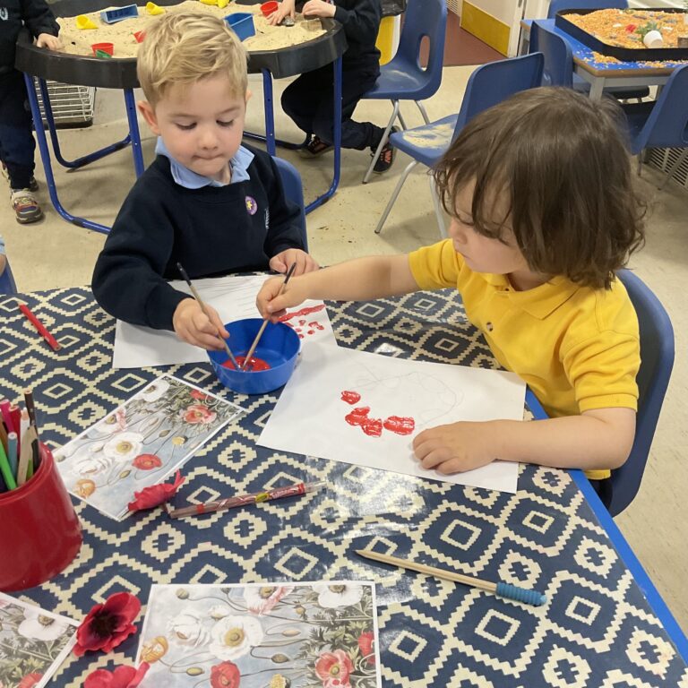 Nursery has been full of energy and excitement, with so many special moments to share. We began with remembrance, visiting the quad to see the beautiful Holmewood poppy wreath. The children joined together for two minutes’ silence, thinking about all the men, women, children and animals who have served and who still serve today. It was a moving occasion, and the children showed such respect. They then painted bright poppy pictures, each one full of colour and imagination, and enjoyed exploring the guestimation jar of red objects, linking to the colour of the poppy while practising counting, estimating and comparing.