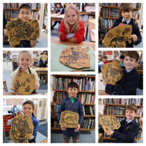 Using cardboard to create a tree bark surface, the Year 4 children have been creating Aboriginal ‘Dreamtime’ pictures using acrylic paints. Whilst listening to Dreamtime stories they sketched their scenes and will start to build up dots using sticks to create a second layer of colour and texture. Tom Johnson