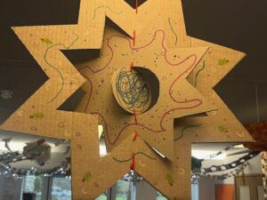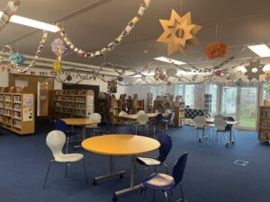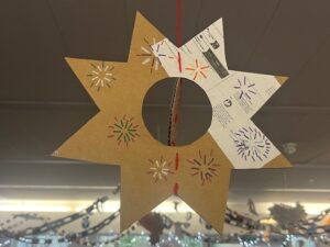 The librarians (and others) have been busy making some spectacular festive decorations for the Learning Hub, all made out of recycled materials.