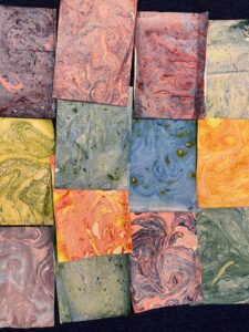 The Book Binding Clubs started this week with paper marbling. Despite only using two pigments they all created some unique colourful designs which will be used to create the cover of their bound book. Because the ink is oil based, the surface will take around 7 weeks to dry which is why this is the first task.