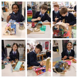 Having created their Cubist inspired sculptural canvases, using cardboard shapes on cradled wood boards, the Year 6 children have been painting them with acrylics, exploring blending and mixing techniques and thinking about forms and composition. The finished artwork will look dynamic and vibrant. Tom Johnson and Keith Siddle
