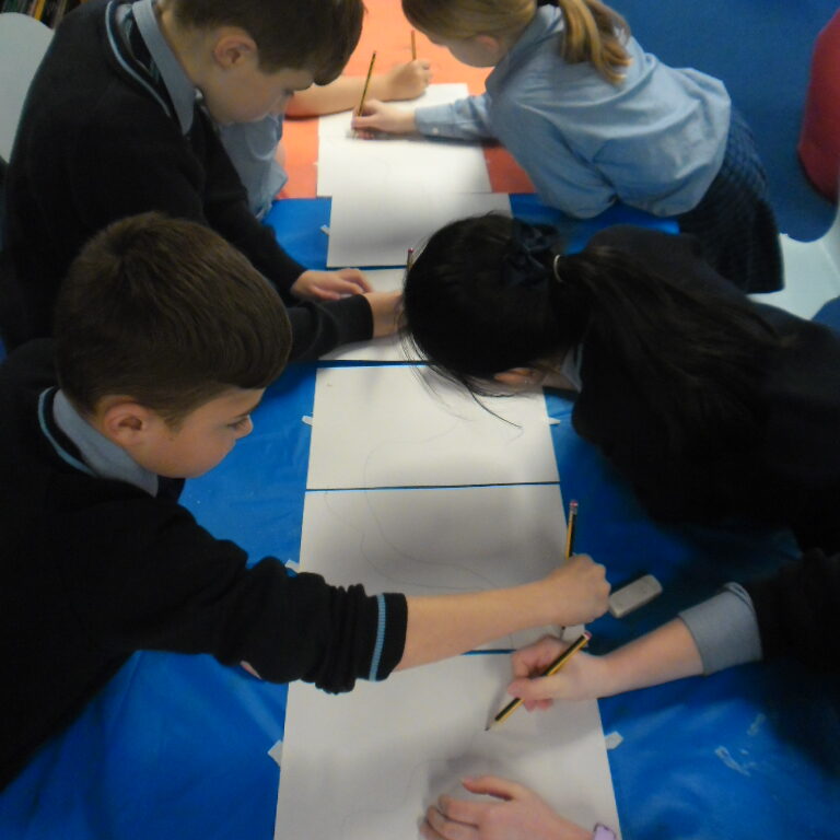 This week Year 4 created their river for their book based on The Tree and the River by Aaron Becker. They had to work together to ensure the individual sections met up so the river (story) flows. They looked at how and to what effect, the illustrator uses colour, light and the changing seasons. They then selected colours for the five sections of their storyline and made rubbings of different textures to create the background for their story pages. Catherine Duncumb