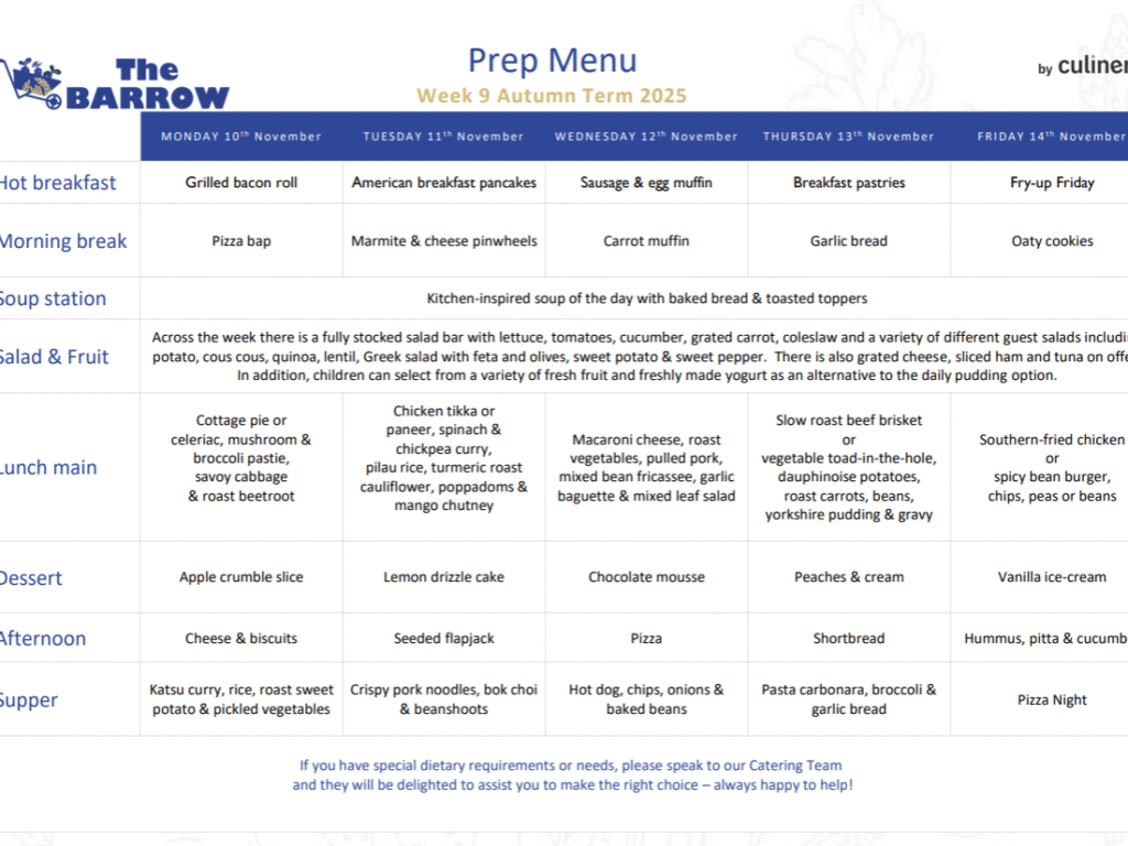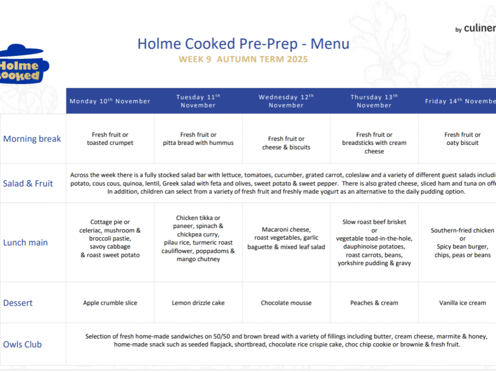 Our catering provision at Holmewood is provided by Culinera, an independently owned and operated catering company, working exclusively in the education sector. They use the best ingredients, nothing processed, nothing added, just honest great food, every day. They source the best quality food available, using suppliers who care about their produce, with the ultimate goal of providing healthy and nutritious meals to all of our children. And of course this includes any specific food allergies or intolerances with meals being carefully prepared so that every dietary need is met.